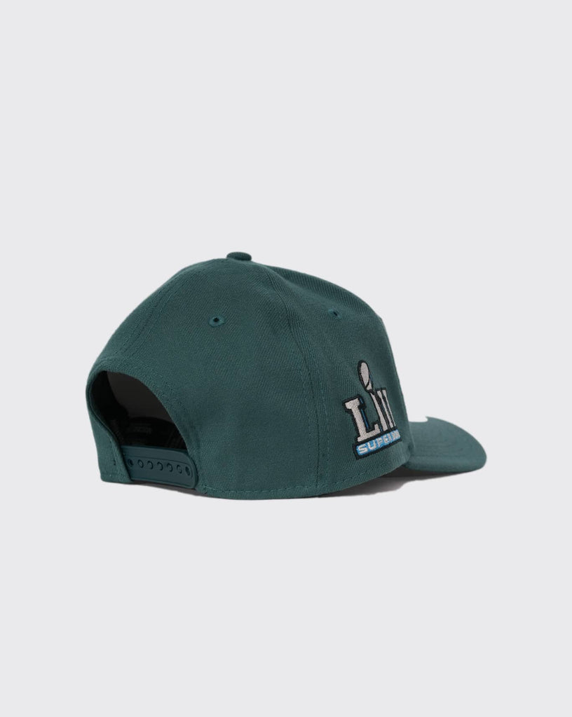The Philadelphia Eagles NFL Super Bowl 9SEVENTY Stretch Snap features embroidered flat Eagles multi-logo detail below a Super Bowl Champions wordmark on a high-profile structured and contoured polyester crown, Super Bowl side patch detail on the right, and at the back an adjustable snapback enclosure.