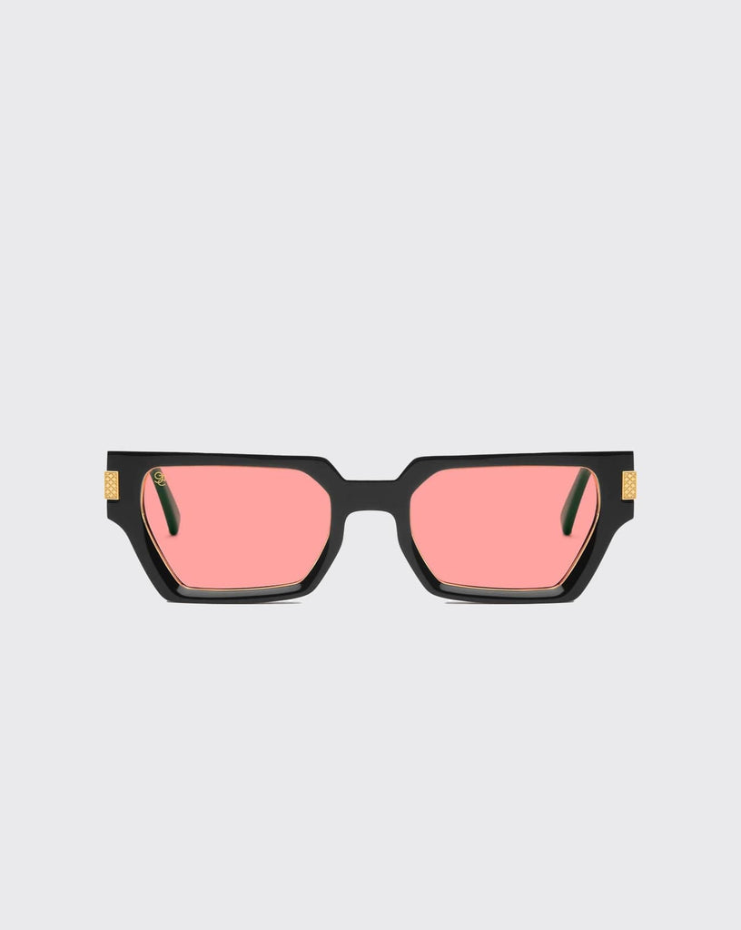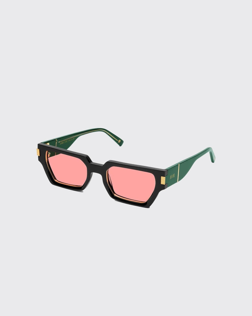 Crafted from handmade Italian acetate. The Locks balances a glossy black frame with Monaco green temples, and is anchored by pink lenses for an unexpected yet harmonious contrast. 24k gold–plated stainless steel accents add weight and quiet structure throughout.