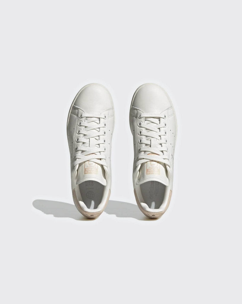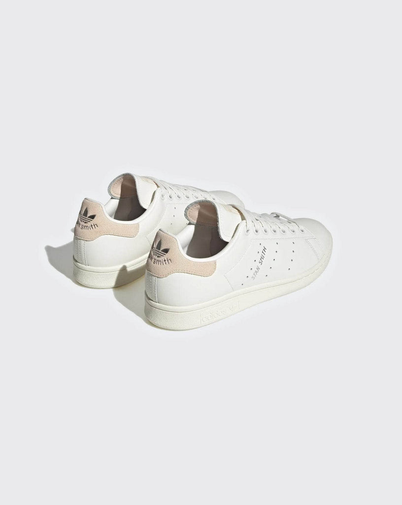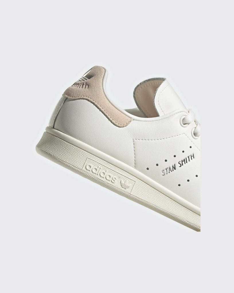 Expressing the power of simplicity. Adidas Stan Smith shoes have never been about trying to be flashy — it's all about clean lines, premium materials and timeless style. This version's leather upper features a suede heel patch with a matching tongue label in soft, muted colours inspired by the archives. The perforated 3-Stripes and rubber cupsole complete the look, proving that an icon never fades, it only gets better with time.